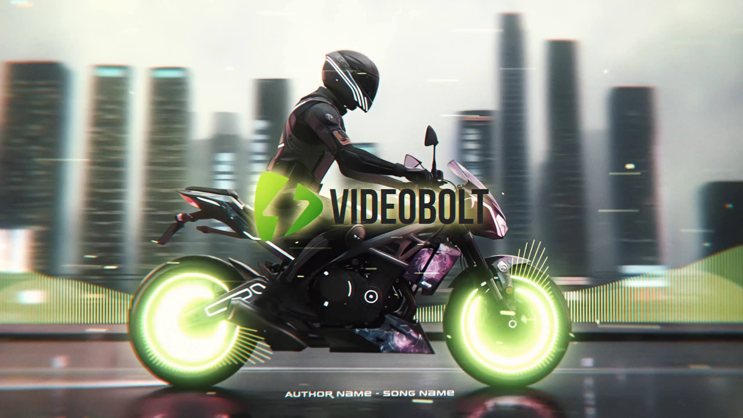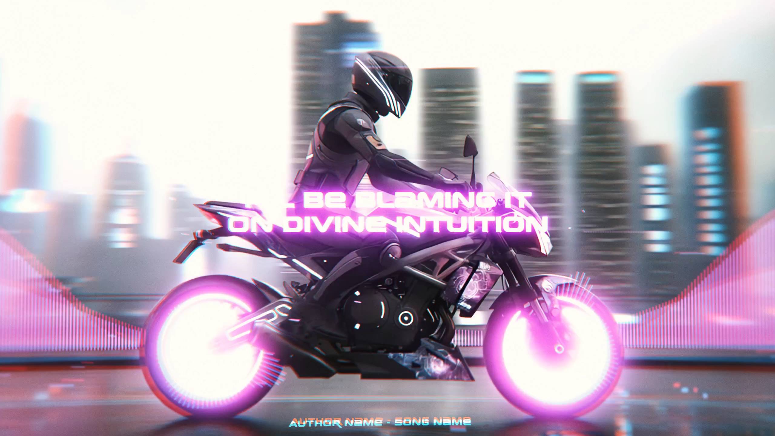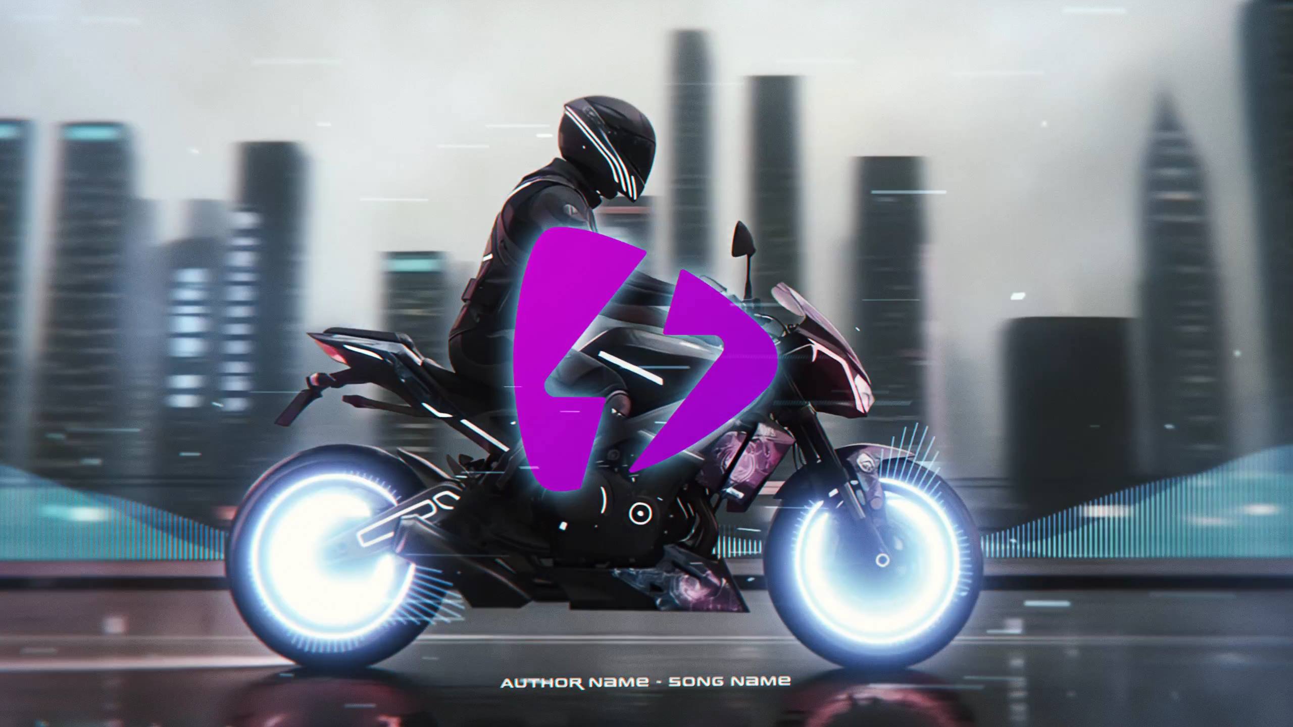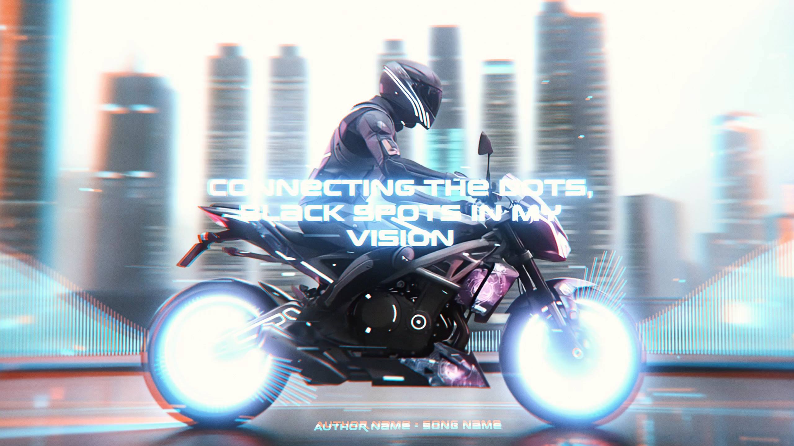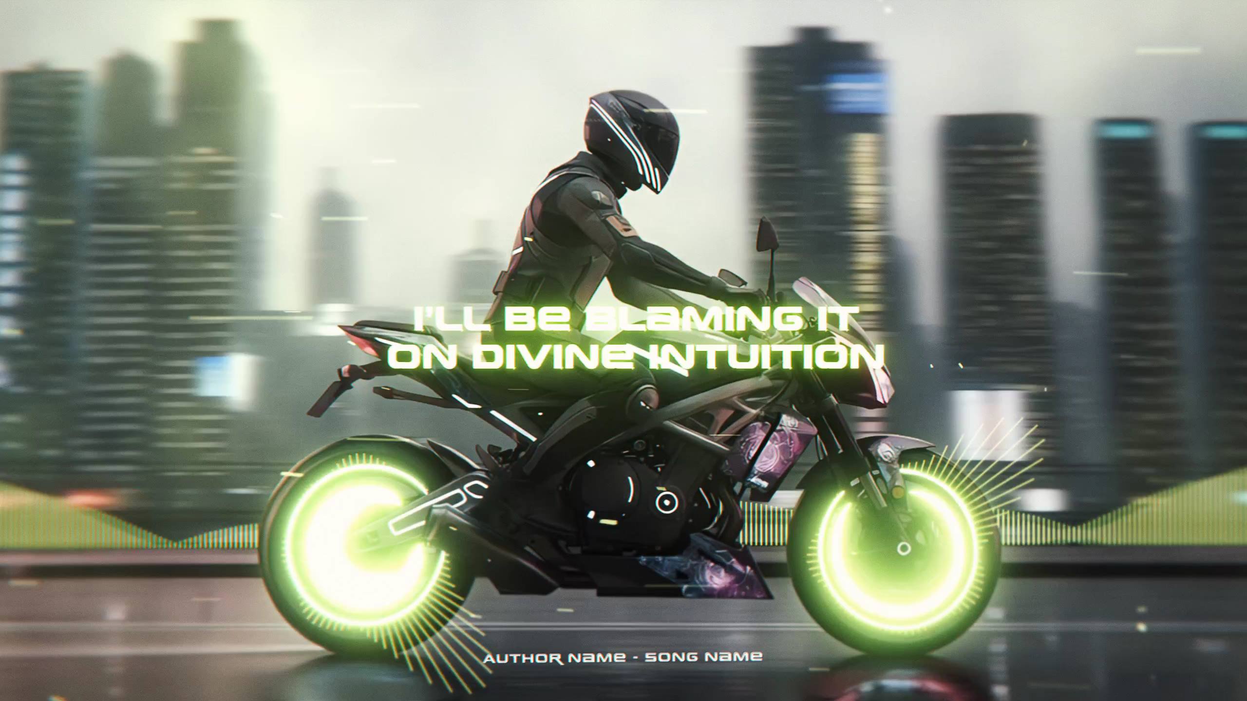 ⚡🎶 Bring your track to life with a neon cyberpunk lyric visualizer. Bold, center-stage lyrics ride alongside a futuristic motorcycle against an urban skyline, while audio‑reactive spectrums pulse to your music.